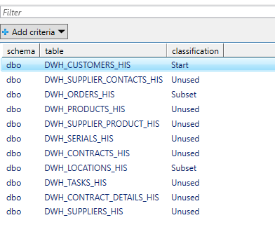 CODEschema table classification ------ ----- -------------- dbo DWH_CUSTOMERS_HIS Start dbo DWH_SUPPLIER_CONTACTS_HIS Unused dbo DWH_ORDERS_HIS Subset dbo DWH_PRODUCTS_HIS Unused dbo DWH_SUPPLIER_PRODUCT_HIS Unused dbo DWH_SERIALS_HIS Unused dbo DWH_CONTRACTS_HIS Unused dbo DWH_LOCATIONS_HIS Subset dbo DWH_TASKS_HIS Unused dbo DWH_CONTRACT_DETAILS_HIS Unused dbo DWH_SUPPLIERS_HIS Unused- And if you like a gridview add | Out-gridview → ([xml](Get-Content Path <SubSetProjectFile>)).project.states.state.pattern |select schema, table, classification | out-gridview