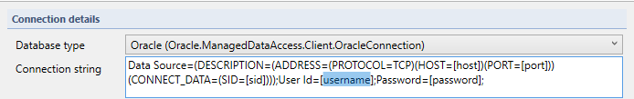 <ConnectionStringTemplate>Data Source=(DESCRIPTION=(ADDRESS=(PROTOCOL=TCP)(HOST=[host])(PORT=[port]))(CONNECT_DATA=(SID=[sid])));User Id=[username];Password=[password];</ConnectionStringTemplate>