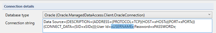 <ConnectionStringTemplate>Data Source=(DESCRIPTION=(ADDRESS=(PROTOCOL=TCP)(HOST=xHOSTx)(PORT=xPORTx))(CONNECT_DATA=(SID=xSIDx)));User Id=xUSERNAMEx;Password=xPASSWORDx;</ConnectionStringTemplate> - Save the file (Mind your permissions)