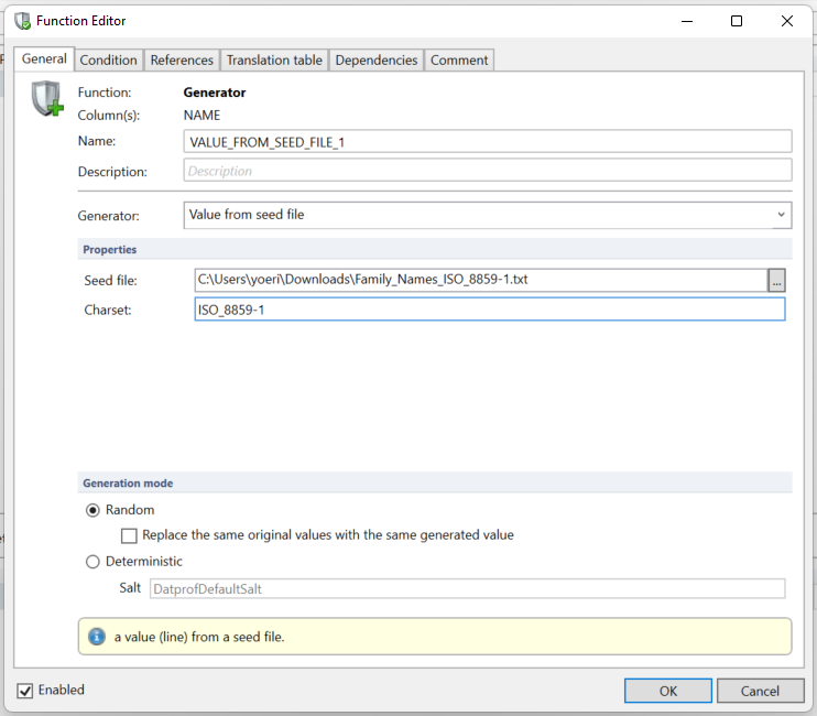 When using Privacy, some functions allow you to supply a seed file. This is a file that contains multiple records from which usually random records are pulled to anonymize data. Because your database and the seed files used may be configured to use a non-Unicode character set, it’s possible to indicate which character set your seed file is encoded in. In general, any character set should be supported.