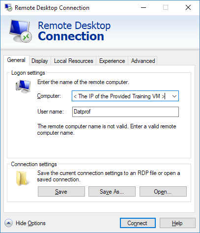 - Click the Show Options toggle to expand the RDP connection tool and fill in the details. The username is Datprof and the IP address is provided to you!
