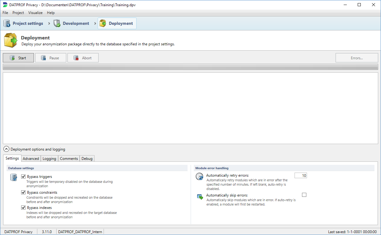 Below the monitor we have some advanced options. DATPROF Privacy will bypass triggers, constraints and indexes on the database by dropping or disabling them. After the run has finished all the triggers, constraints and indexes will be restored.