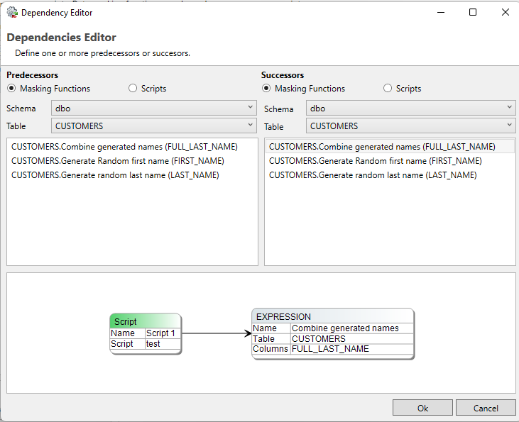 DATPROF Privacy creates dependencies whenever two masking functions can target the same table at the same time. This can cause severe data corruption and deployment errors. A dependency created by DATPROF Privacy can be overruled by the user using the Dependency editor.
