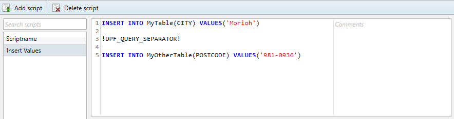 In order to execute multiple batches within one transaction (meaning, separate queries which will rollback if one of them fails), the user can specify a special separator command in the body of the query specified in the script manager. This special command is “ !DPF_QUERY_SEPARATOR! “. If a complex script is being copied over from a database management tool, all query separator symbols can simply be replaced with the separator command, and should not remain in the query.