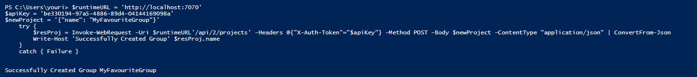$resProj = Invoke-WebRequest -Uri $runtimeURL'/api/2/projects' -Headers @{"X-Auth-Token"="$apiKey"} -Method POST -Body $newProject -ContentType "application/json" | ConvertFrom-Json