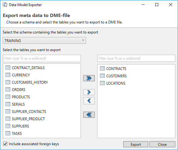 Project → Export Metadata to DME file, the project data model can be exported to a DME file. In the dialog the user can specify the tables (per schema) to be exported. The corresponding foreign keys can be exported too.